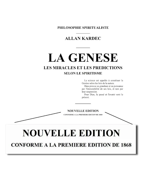 OBSERVACIÓN: Estas ediciones traducidas al Español de la CEA - CEI - FEB - FEE - pertenecen a la adulterada quinta edición de la Génesis Francesa, ya que esta quinta edición jamás fue aprobada por Kardec y que salió después de su muerte en 1869. Se puede comprobar estas adulteraciones, con la traducción que hicieron de la segunda edición original de 1868 de la Génesis al Español por la Sociedad Barcelonesa de Espiritismo en 1871, más abajo encuentran el link.