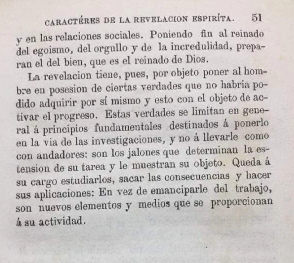 11. —Una revelación n importante tiene lugar en la época presente, y es la que nos muestra la posibilidad de comunicar con los séres del mundo espiritual. Éste conocimiento no es nuevo en verdad; pero ha quedado hasta ahora en estado de letra muerta, es decir, sin ser de provecho alguno para la humanidad. La ignorancia de las leyes que rigen ésta clase de relaciones, lo había ahogado bajo el peso de la supersticion: el hombre era incapaz de sacar deducción alguna saludable. Estaba reservado a nuestra época desembarazarla de sus accesorios ridículos, comprender su alcance y hacer salir de ella la luz que debía alumbrar el camino del porvenir.